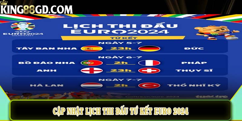 Cập nhật lịch thi đấu tứ kết Euro 2024 nhanh chóng và chuẩn xác cho ngày 5/7 đến 7/7. Bạn là tân thủ mới chơi và tham gia cá cược hay chưa cập nhật thông tin 4 trận đấu tứ kết, hãy tham khảo ngay bài viết sau. King88 tổng hợp về thông tin lịch…